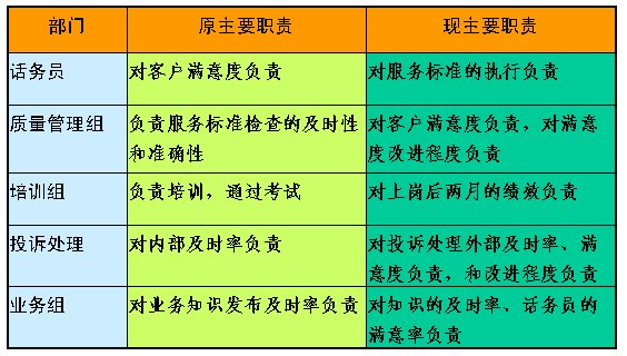 首先,要根據(jù)組織的目標(biāo)來(lái)確定我們需要哪些流程,即需要哪些流程才能保證組織目標(biāo)的實(shí)現(xiàn);其次,根據(jù)流程的需要,即為了保證流程的有效運(yùn)行,來(lái)劃分不同部分的職責(zé);最后,根據(jù)各部分職責(zé)的劃分來(lái)設(shè)置組織的架構(gòu)。如我們根據(jù)客服中心流程運(yùn)行的需要,對(duì)組織架構(gòu)和相關(guān)班組的主要職責(zé)進(jìn)行了調(diào)整,以保證流程的有效順暢運(yùn)行。如部分班組的主要職責(zé)調(diào)整如下: