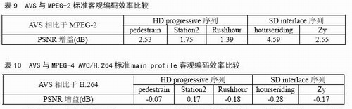 對視頻編碼標(biāo)準(zhǔn)進(jìn)行客觀評價的常用方法是峰值信噪比PSNR。表9、表10分別給出了AVS與MPEG-2標(biāo)準(zhǔn)以及AVS與MPEG-4 AVC/H.264標(biāo)準(zhǔn)main