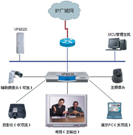 一般我們建議在電視會議室配置兩臺帶S-Video端子或者復合端子的電視機或者背投,一臺用于顯示遠端會場畫面,一臺用于顯示本端會場畫面。電視機尺寸可根據會場大小來選擇。另外我們還建議在會場布置一臺高分辨率投影儀,用于顯示雙流畫面(PC畫面)。
