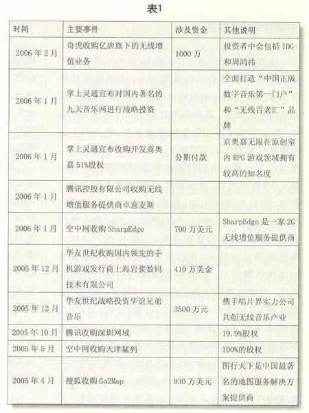 從2003年開(kāi)始,國(guó)內(nèi)就顯現(xiàn)出并購(gòu)增值服務(wù)運(yùn)營(yíng)企業(yè)的苗頭。2004年以來(lái),隨著整治增值服務(wù)運(yùn)營(yíng)企業(yè)的力度不斷加大,并購(gòu)漸成風(fēng)潮(見(jiàn)表1)。2004年2月,新浪收購(gòu)深圳網(wǎng)興科技公司;2004年5月,搜狐收購(gòu)手機(jī)WAP服務(wù)提供商北京吉菲爾公司。2005年,在“超級(jí)女生”節(jié)目大獲成功后,掌上靈通宣布將對(duì)國(guó)內(nèi)著名的九天音樂(lè)網(wǎng)進(jìn)行戰(zhàn)略投資,全面打造“中國(guó)正版數(shù)字音樂(lè)第一門戶”和“無(wú)線百老匯”品牌。各大移動(dòng)增值業(yè)務(wù)服務(wù)商通過(guò)并購(gòu)競(jìng)爭(zhēng)對(duì)手,門戶網(wǎng)站可以在移動(dòng)增值服務(wù)領(lǐng)域?qū)で笮碌耐黄,獲得可觀的利益,增強(qiáng)自身的競(jìng)爭(zhēng)力。伴隨著3G商用的日益臨近和市場(chǎng)競(jìng)爭(zhēng)的不斷加劇,主流SP(服務(wù)提供商)進(jìn)一步加快了資本購(gòu)并和業(yè)務(wù)整合的步伐,整個(gè)SP行業(yè)將加速洗牌。經(jīng)過(guò)市場(chǎng)整合,主流SP將不斷做大做強(qiáng),而相當(dāng)多的缺乏市場(chǎng)競(jìng)爭(zhēng)力的SP將被淘汰出局。