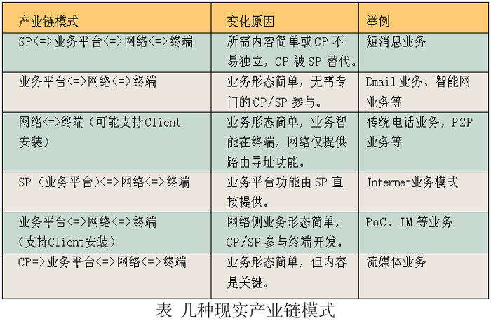 隨著數(shù)據(jù)業(yè)務(wù)的發(fā)展,電信業(yè)務(wù)逐漸由傳統(tǒng)的封閉業(yè)務(wù)體系向產(chǎn)業(yè)鏈開放的業(yè)務(wù)體系發(fā)展。目前,獨(dú)立的內(nèi)容提供商(CP)和業(yè)務(wù)提供商(SP)在產(chǎn)業(yè)鏈中的出現(xiàn)已經(jīng)成為許多具體業(yè)務(wù)開展的需要,此時(shí),典型的產(chǎn)業(yè)鏈模式為: CP=> SP< =>業(yè)務(wù)平臺(tái)< =>網(wǎng)絡(luò)< =>終端,而現(xiàn)實(shí)中的產(chǎn)業(yè)鏈模式可以通過該模式變化得到,如下表所示。