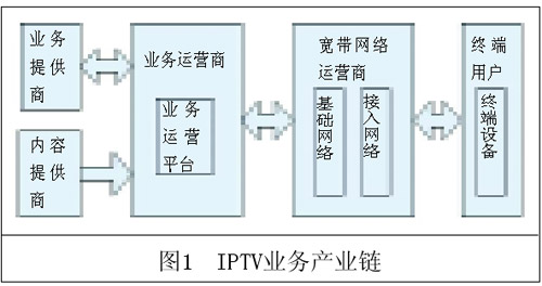 圖1所示的IPTV業(yè)務(wù)產(chǎn)業(yè)鏈中,主要角色包括內(nèi)容提供商/業(yè)務(wù)提供商(CP/SP)、業(yè)務(wù)運(yùn)營商、網(wǎng)絡(luò)運(yùn)營商和終端用戶。業(yè)務(wù)運(yùn)營商具有IPTV業(yè)務(wù)運(yùn)營資質(zhì),通過業(yè)務(wù)運(yùn)營平臺(tái)保證業(yè)務(wù)的提供和管理運(yùn)營,起著業(yè)務(wù)主導(dǎo)的作用;內(nèi)容提供商為業(yè)務(wù)運(yùn)營商提供內(nèi)容,業(yè)務(wù)提供商向業(yè)務(wù)運(yùn)營商提供增值業(yè)務(wù),使得業(yè)務(wù)中的內(nèi)容和種類豐富多彩以滿足用戶的不同需求,內(nèi)容提供商和業(yè)務(wù)提供商一般能根據(jù)用戶的使用情況獲取收入分成; 網(wǎng)絡(luò)運(yùn)營商通過提供基礎(chǔ)網(wǎng)絡(luò)和接入網(wǎng)絡(luò)服務(wù)保證業(yè)務(wù)的傳送和質(zhì)量; 終端用戶通過使用終端設(shè)備選擇和使用業(yè)務(wù),并支付相關(guān)費(fèi)用。