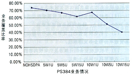 由圖1可知,當(dāng)HSDPA分配功率為5W時(shí),HSDPA對(duì)網(wǎng)絡(luò)覆蓋沒有很大影響;當(dāng)它為10W時(shí),如果HSDPA用戶數(shù)不大,影響也有限;但是,當(dāng)它為10W時(shí),如果HSDPA用戶數(shù)持續(xù)增加,則會(huì)產(chǎn)生嚴(yán)重影響。在下行從NOHSDPA的74%降低到10W15U的40.62%時(shí),PS384業(yè)務(wù)降低了近一半。同時(shí),隨著業(yè)務(wù)速率的提高,網(wǎng)絡(luò)影響越大。另外,在一定的HSDPA功率分配前提下,隨著HSDPA用戶數(shù)的增加,過載率增大,網(wǎng)絡(luò)中高速數(shù)據(jù)業(yè)務(wù)的比例隨之減少,各點(diǎn)上的用戶速率不斷降低;同時(shí),用戶的增多使得各小區(qū)的HSDPA發(fā)射功率不斷增大,導(dǎo)致區(qū)域中間各點(diǎn)的終端接收功率普遍增加。