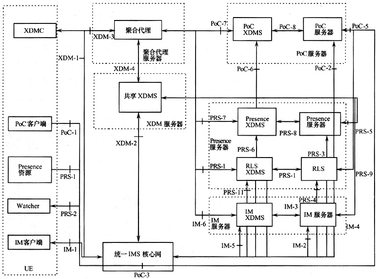 OMA雖然定義了XDM、Presence(呈現(xiàn))、Instant Message和PoC等業(yè)務(wù)的功能實體和參考點,但是為了在網(wǎng)絡(luò)中實現(xiàn)以上業(yè)務(wù),需要將OMA定義的功能實體和參考點映射成物理實體和協(xié)議,確定運營商開放此類業(yè)務(wù)對設(shè)備和協(xié)議的要求,圖2給出了一種映射的方式。XDM服務(wù)器包含的共享XDMS功能提供公共群組的能力,有利于用戶在使用PoC、IM等業(yè)務(wù)時也能共享此群組。