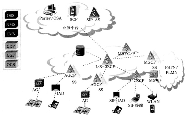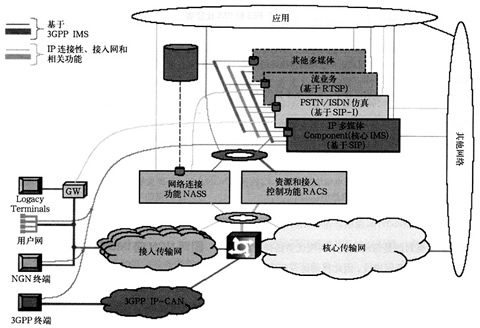 業(yè)務層包括下面的元素:PSTN/ISDN模擬子系統(tǒng)(PSS)即IMS核心子系統(tǒng)、PSTN/ISDN仿真子系統(tǒng)(PES)、其他多媒體子系統(tǒng)(如流媒體子系統(tǒng)、內容多播子系統(tǒng)等)和應用以及可以用于多個子系統(tǒng)的公共元素(如接入應用、計費功能、用戶屬性管理、安全管理和路由管理等);傳送層為用戶終端提供了基本的IP連接的能力,其中的網絡附屬子系統(tǒng)(NASS)和資源認證控制子系統(tǒng)(RACS)屏蔽了IP層以下的接入網/核心網所使用的傳送技術,給固網NGN用戶終端提供了IP的連續(xù)性。