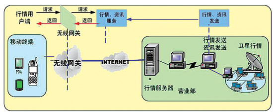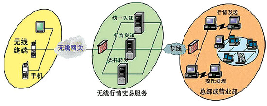 從技術(shù)上說,“移動交易廳”主要采用WAP及專用手機(jī)客戶端方式,客戶可以通過訪問證券公司專門申請的域名(如廣發(fā)證券公司的http://wap.gf.com.cn),鏈接到證券公司的WAP手機(jī)炒股系統(tǒng)服務(wù)器,下載手機(jī)客戶端軟件,然后通過無線接入網(wǎng)關(guān)登錄到移動證券業(yè)務(wù)平臺。移動證券業(yè)務(wù)平臺的行情及委托交易系統(tǒng)完全利用現(xiàn)有的網(wǎng)上交易系統(tǒng)的資源。
