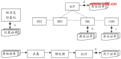 通過對移動(dòng)點(diǎn)對點(diǎn)短消息計(jì)費(fèi)原理的分析,可以把整個(gè)計(jì)費(fèi)過程劃分為兩大環(huán)節(jié):計(jì)費(fèi)點(diǎn)原始話單的生成和后期計(jì)費(fèi)處理系統(tǒng)的處理。如果其中任何一個(gè)環(huán)節(jié)出現(xiàn)差錯(cuò)都會降低用戶計(jì)費(fèi)話單的準(zhǔn)確性。因此在測試過程中采取了用戶層面和設(shè)備層面相結(jié)合的方法:一方面使用仿真儀表大量模擬點(diǎn)對點(diǎn)短消息的發(fā)送和接收,得到用戶話單;一方面分析各個(gè)計(jì)費(fèi)點(diǎn)生成的原始話單。