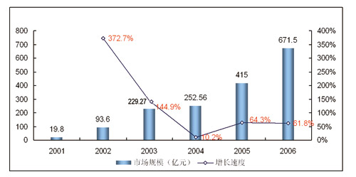 圖 2001-2006年中國移動用戶增值業(yè)務市場規(guī)模