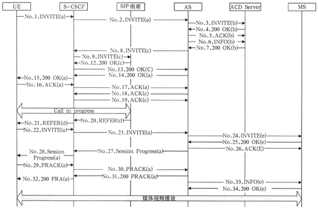 - No.33~34:AS根據(jù)用戶(hù)的相關(guān)信息去數(shù)據(jù)庫(kù)檢索所需媒體資源的文件名,并以INFO消息指示MS開(kāi)始播放多媒體視頻;MS以200響應(yīng)收到的INFO消息,根據(jù)INFO消息中攜帶的媒體文件名去資源服務(wù)器中獲取該資源,并播放該多媒體資源。