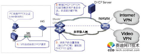 當(dāng)網(wǎng)絡(luò)設(shè)備收到STB的DHCP請求報文時,需要在報文后添加OPTION82字段,此時有兩種模式進(jìn)行DHCP+認(rèn)證,一種是直接把DHCP報文送給DHCP服務(wù)器,由DHCP服務(wù)器根據(jù)OPT82字段來判斷該用戶是否為合法用戶,從而決定是否為其分配IP地址。另一種是DHCP報文先送到BRAS,由BRAS將OPT82字段放到RADIUS的一個子域里,通過RADIUS服務(wù)器來進(jìn)行用戶合法性認(rèn)證,若用戶合法,再由DHCP服務(wù)器分配IP地址。