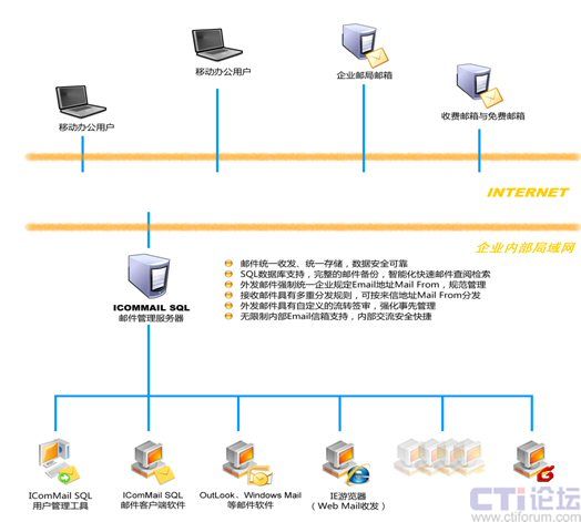 IComMail SQL企業(yè)郵件管理系統(tǒng)是?弟浖瞥龅膬(yōu)秀的郵件管理軟件,自2003年首推自今已有5年的發(fā)展歷史,系統(tǒng)設計先進、功能獨特完整、運行穩(wěn)定可靠,在國內已有大批裝機用戶,其中以外貿、進出口等外向型企業(yè)為主要用戶群,廣大用戶已經(jīng)獲得了極大的受益。IComMail SQL系統(tǒng)主推的是其強大的郵件管理功能,與通常的郵件服務器Mail Server系統(tǒng)有著根本的區(qū)別,也有別于日趨流行的企業(yè)郵局服務,IComMail SQL系統(tǒng)是建立在通常的郵件服務器Mail Server或企業(yè)郵局的應用基礎上的,在企業(yè)局域網(wǎng)內設立一IComMail郵件管理服務器,并采用穩(wěn)定可靠的SQL數(shù)據(jù)庫系統(tǒng)作為支撐,為企業(yè)建立安全可靠的企業(yè)郵件數(shù)據(jù)中心,并在此基礎上,擴展了很多高級的企業(yè)郵件管理功能,使企業(yè)的郵件應用水平有質的提升。