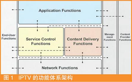 最終的IPTV的體系架構(gòu)與第六次會(huì)議的體系架構(gòu)沒(méi)有太大的差別,只是在細(xì)微之處進(jìn)行了細(xì)化和完善。IPTV的功能體系架構(gòu)包含7個(gè)部分:端用戶(hù)功能、應(yīng)用功能、業(yè)務(wù)控制功能、內(nèi)容分發(fā)功能、網(wǎng)絡(luò)功能、管理功能和內(nèi)容提供功能,如圖1所示。