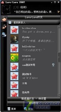 而Lava-Lava更是將整合功能發(fā)揮得淋漓盡致。上了Lava-Lava,還得惦記著MSN和雅虎通的好友,都登錄吧,不僅占用內(nèi)存資源還嫌麻煩,現(xiàn)在不用再發(fā)愁了,新版lava不僅已經(jīng)集成了MSN好友分組,還可以與雅虎通的好友互通,以后能在lava-lava上直接與MSN或雅虎通好友交流了。操作方法相當(dāng)簡(jiǎn)單,在你的主界面,添加MSN和雅虎通好友分組即可(圖14)。