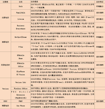 從全球范圍來看,大多數(shù)重要的固定運(yùn)營商、移動(dòng)運(yùn)營商和綜合性運(yùn)營商都已經(jīng)開始或計(jì)劃提供各種形式FMC業(yè)務(wù)(見表)。其中大多數(shù)運(yùn)營商提供捆綁業(yè)務(wù)和簡單的融合業(yè)務(wù),而歐美的一些頂尖運(yùn)營商已推出基于融合終端的FMC業(yè)務(wù)。