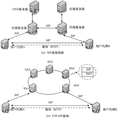 圖1 SIP系統(tǒng)架構(gòu)和P2P-SIP架構(gòu)比較