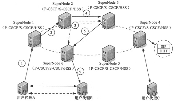 在分布式IMS架構(gòu)中,每一個(gè)SuperNode都包含兩類功能:基于DHT的HSS功能和基于SIP的會(huì)話控制功能;赟IP的會(huì)話控制功能包括P-CSCF功能和S-CSCF功能,P-CSCF為用戶代理接入到系統(tǒng)中的入口點(diǎn),S-CSCF扮演歸屬地會(huì)話控制的角色。P-CSCF和S-CSCF的功能和3GPP