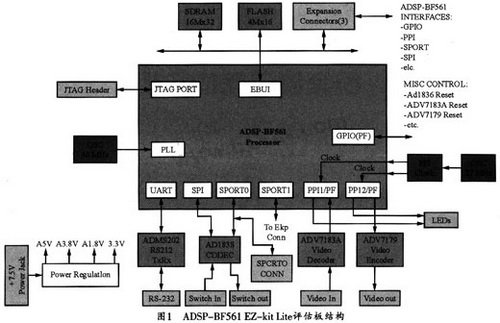 Blackfin561視頻編碼器的硬件結構如圖1所示。該硬件平臺采用ADI公司的ADSP-BF561 EZ-kit