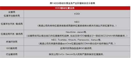 以日本KDDI為例,移動位置業(yè)務(wù)的產(chǎn)業(yè)價值鏈狀況如表1所示。