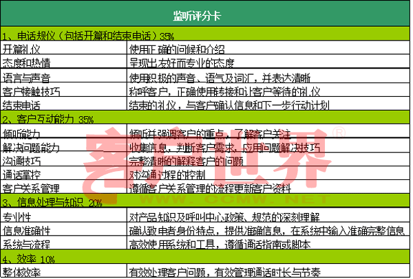 b.一個不可忽視的工作是對表中的各項進行嚴(yán)格定義,然后訓(xùn)導(dǎo)師與主管、培訓(xùn)、質(zhì)檢師根據(jù)共同的錄音資料反復(fù)“核對筆記”,取得共識,并將樣本打分結(jié)果發(fā)給座席代表溫習(xí)。