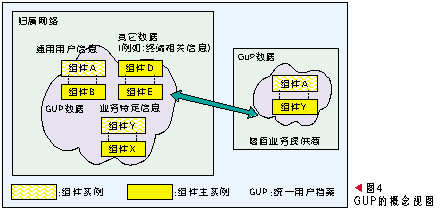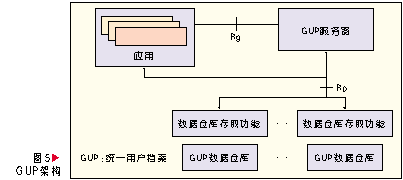 GUP中一個(gè)用戶相關(guān)的數(shù)據(jù)由多個(gè)數(shù)據(jù)組件構(gòu)成,每個(gè)組件又可以包含多個(gè)數(shù)據(jù)單元。在網(wǎng)絡(luò)中用戶數(shù)據(jù)每個(gè)數(shù)據(jù)組件只有一個(gè)主實(shí)例,但是可以有多個(gè)復(fù)制實(shí)例。用戶數(shù)據(jù)以組件為單元可以存放在不同的網(wǎng)絡(luò)實(shí)體中,應(yīng)用可以通過統(tǒng)一的訪問入口以標(biāo)準(zhǔn)接口訪問所有授權(quán)的數(shù)據(jù),這個(gè)入口功能由GUP 服務(wù)器擔(dān)任。GUP 服務(wù)器負(fù)責(zé)隱藏管理域中數(shù)據(jù)的分布細(xì)節(jié),并執(zhí)行相應(yīng)的安全、運(yùn)營策略,確保數(shù)據(jù)的安全性及運(yùn)營所必須的計(jì)費(fèi)功能。