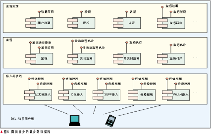 在圖1的網(wǎng)絡(luò)層次中,存在4種服務(wù)商角色:接入網(wǎng)提供商、業(yè)務(wù)網(wǎng)運(yùn)營商、業(yè)務(wù)提供商、聚合門戶網(wǎng)站。業(yè)務(wù)網(wǎng)運(yùn)營商可以在用戶簽約時(shí)提供多個(gè)業(yè)務(wù)提供者、聚合門戶網(wǎng)站的簽約選項(xiàng),用戶可以選擇在成為業(yè)務(wù)網(wǎng)運(yùn)營商的客戶的同時(shí)也成為多個(gè)感興趣的業(yè)務(wù)提供商的會(huì)員,后兩者可以訪問業(yè)務(wù)網(wǎng)運(yùn)營商的認(rèn)證、授權(quán)和計(jì)費(fèi)(AAA)基礎(chǔ)設(shè)施,從而對用戶身份進(jìn)行統(tǒng)一的認(rèn)證、授權(quán)和計(jì)費(fèi)。業(yè)務(wù)提供商和業(yè)務(wù)網(wǎng)運(yùn)營商之間的劃分可以采用結(jié)算制也可以采用批發(fā)業(yè)務(wù)的方式。