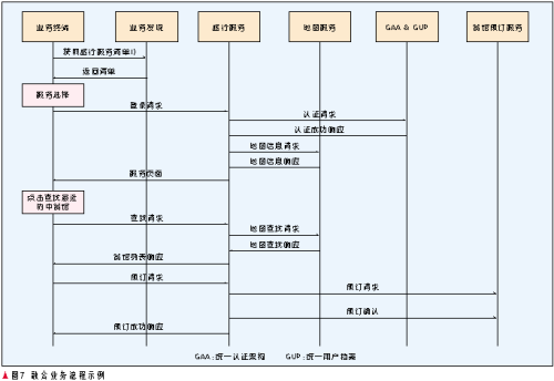 首先王先生的PDA通過歸屬網(wǎng)絡(luò)的業(yè)務(wù)發(fā)現(xiàn)服務(wù)器獲得旅行服務(wù)的主頁列表,他選擇一家訪問其旅行服務(wù),旅行服務(wù)通過其歸屬網(wǎng)絡(luò)的GAA&GUP對該終端進(jìn)行認(rèn)證以及提供旅行服務(wù)的授權(quán),成功后,旅行服務(wù)向地圖服務(wù)請求地圖信息并隨服務(wù)頁面一齊返回給終端,王先生點(diǎn)擊查找“離我最近的中餐館”按鈕,旅行服務(wù)將請求代理轉(zhuǎn)發(fā)給地圖服務(wù),后者返回中餐館列表(用戶的位置信息可以由用戶上報(bào),或者由旅行服務(wù)查詢用戶歸屬網(wǎng)絡(luò)的位置服務(wù)獲得),旅行服務(wù)轉(zhuǎn)發(fā)給終端,當(dāng)王先生選擇一個(gè)中餐館并預(yù)訂時(shí),旅行服務(wù)調(diào)用該餐館的預(yù)訂服務(wù),訂單傳給相應(yīng)服務(wù)人員,流程完成。
