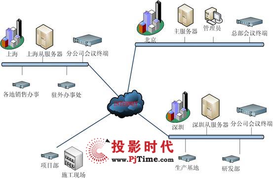 3臺高端專用服務(wù)器作為視頻會議服務(wù)器,可容納多點同時開會,以確保系統(tǒng)的穩(wěn)定性和性能要求。主服務(wù)器放置在總公司,從服務(wù)器共2個,分別放置在輻射分公司面大,位于分公司中心的兩個城市。所有接入的服務(wù)器和客戶端采用同一網(wǎng)絡(luò)服務(wù)商的線路。配置了使用1000M服務(wù)器專用網(wǎng)卡,以保證正常的音視頻信號的傳輸。并且將服務(wù)器放置在主干/核心交換機(jī)上,使服務(wù)器和客戶端的路由/交換性能達(dá)到最佳效果。其網(wǎng)絡(luò)拓?fù)鋱D如下: