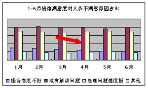 客服代表的工作情緒及客戶滿意度呈現(xiàn)上升趨勢(shì):3-6月的短信滿意度穩(wěn)步提升(見(jiàn)下圖1),6月短信滿意度較3月提升1.25個(gè)百分點(diǎn),短信滿意度調(diào)查中“非常滿意”項(xiàng)占比自4月份開(kāi)上升1.42個(gè)百分點(diǎn)(見(jiàn)下圖2)。從客戶不滿意原因情況看,由于人員導(dǎo)致客戶不滿意的比例下降0.6%(見(jiàn)下圖3);對(duì)導(dǎo)致人員不滿意的原因分析可知,話務(wù)員服務(wù)態(tài)度不好的占比有明顯的下降(見(jiàn)下圖4)。