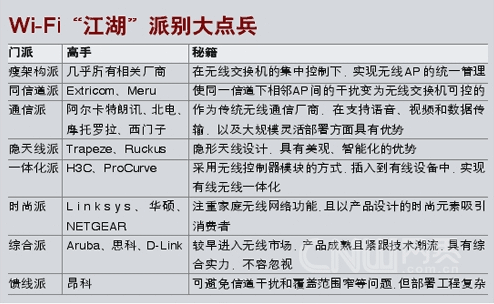少林、武當(dāng)、華山、峨嵋、丐幫……眾多門派共同支撐起了武俠小說當(dāng)中的“江湖”。而在無線網(wǎng)絡(luò)的“江湖”上,其實(shí)也存在著很多門派:比如瘦架構(gòu)派、同信道派、一體化派、通信派、隱天線派、時(shí)尚派等,各家廠商都有自己的看家本事,在極大豐富了無線產(chǎn)品,更好滿足了用戶需求的同時(shí),也促進(jìn)了無線技術(shù)在多個(gè)層面上的深入發(fā)展。