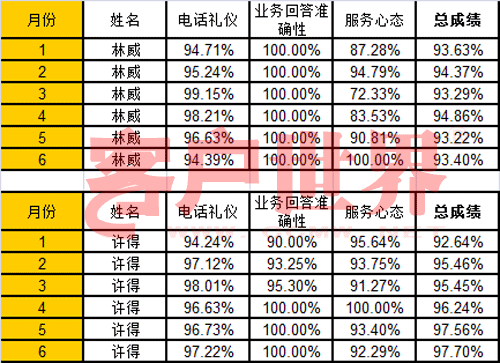 上面這兩張表格,是兩位員工的質(zhì)檢分?jǐn)?shù),從今年一月份開始,一月到六月每個(gè)月的質(zhì)檢分?jǐn)?shù),你看到有總分,還有三個(gè)分項(xiàng)的成績。請問,林威是新員工,還是許得是新員工?我們下一期公布答案。