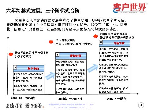 六年的跨越式發(fā)展,走過了集中初始,規(guī)模運營兩個階段。曾經獲得也是今天主辦方的06年中國(企業(yè)自建型)最佳呼叫中心稱號。如今在集中化、標準化、信息化的基礎上,正在向專線專席標準化的熱線服務轉型。