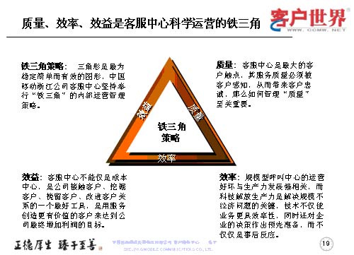 應該說這三個方面是科學運營的一個鐵三角,這是我們的理解,因為三角形,始終認為是最穩(wěn)定、簡單、有效的圖形,也是我們在進行內部運營的管理鐵架。質量是客服中心最大的觸點當中被客戶感知,從而帶來客戶忠誠的,如何管理質量,那就至關重要。效率尤其是規(guī)模型的呼叫中心的運營好壞,是與生產力的發(fā)展強相關,而科技解放生產力是解決規(guī)模問題的關鍵。技術不僅是運行更具效益率,同時還對企業(yè)的決策作出預先準備,而不僅僅是事后反應。很多年來,更多的企業(yè)是把客服中心視為成本中心,而事實上,效益的顯現(xiàn)讓我們陸續(xù)地走出了成本中心,它應該是公司接觸客戶、挖掘客戶、挽留客戶、改進客戶關系的一個最好工具,是用服務創(chuàng)造更有價值的客戶,來達到公司最終增加利潤的目標。