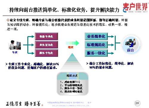 三個階段可以分為集中初始的02年10月到04年,規(guī)模運營是04年底到07年的4月,那么07年4月至今已經是專線專席運營。我們的重點是在規(guī)模運營和專線專席上有所突破,規(guī)模運營主要是結合品牌策略,率先推出的是品牌客戶分層服務;雙中心網絡呼叫中心解決方案應用,實現(xiàn)互聯(lián)網思維模式及邏輯管理集中,物理結構分散的多中心網絡呼叫中心;追求客戶滿意,運營效率和效益的統(tǒng)一。07年開始,我們重點實現(xiàn)客服系統(tǒng)與業(yè)務BOSS系統(tǒng)的全面融合,實現(xiàn)客戶服務應用的統(tǒng)一門戶。也就是說,無論是我們的電話服務、營業(yè)廳的服務,還是客戶經理的上門服務,都應用于客戶服務的統(tǒng)一門戶,實現(xiàn)著CRM的客戶關系管理。對于電話服務來講,我們以標準化、專業(yè)化的熱線服務運營模式,提升專家級的精細化服務和大眾客戶的標準化服務,使得管理和培訓更聚焦,客戶代表更為輕松,同時也提高了員工滿意度,實現(xiàn)了追求客戶愉悅體驗、員工滿意和為企業(yè)創(chuàng)造價值。