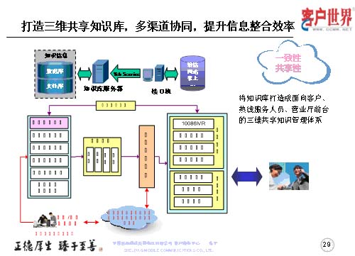 打造三維共享知識庫,多渠道協(xié)同,提升信息整合效率。我們的知識庫服務器是基于客戶系統(tǒng)的大平臺,形成熱線服務人員、營業(yè)廳人員,乃至客服經理的三維共享知識庫共享,以保障了服務的一致性,服務渠道的共享性。