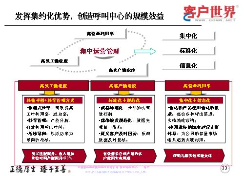 作為集中管理來講,突出“三高”,運用好“三高”體現(xiàn)的是如何進行集中化、標準化和信息化。我們從高員工滿意度,高客戶滿意度和高資源利用率入手,高員工滿意度主要是應用平臺和科學的管理方法,使得員工的技能持續(xù)提升,員工的自身收入也按單位時間而增長;高客戶滿意度是用標準化和規(guī)范化來進一步優(yōu)化流程,改進操作,對于目標客戶及時回訪,有效地延長公司產品的客戶使用生命周期,以創(chuàng)造公司的最大利益;作為集中化的呼叫中心,系統(tǒng)已經投入了較大的座席規(guī)模,高資源利用率是如何把這些座席和系統(tǒng)的規(guī)模應用得更好,使得我們的產品能夠進一步地推向市場,被客戶所接受,所以我們采取了更多的整合呼出渠道,精確營銷,尤其對公司的存量客戶進行持續(xù)維系的關鍵時刻,達到營銷與服務效率的最大化。