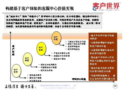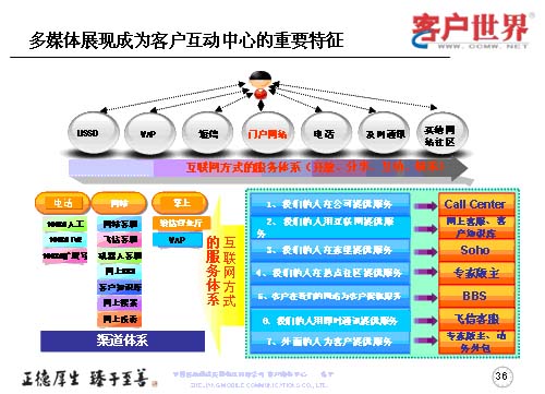 世界上卓越的企業(yè)無所不在,在客戶戰(zhàn)略上最具創(chuàng)新能力的企業(yè),奠定起的競爭,也會越來越出體現(xiàn)在客戶關系管理上,隨著數(shù)據業(yè)務成為運營商的主流業(yè)務,呼叫中心在服務、營銷、渠道管理等方面的戰(zhàn)略地位會日益重要,隨著客戶接觸的不斷增長,呼叫中心將逐漸演變成客戶接觸中心、互動中心,乃至包括實體渠道之外的各種電子渠道,任重而道遠。