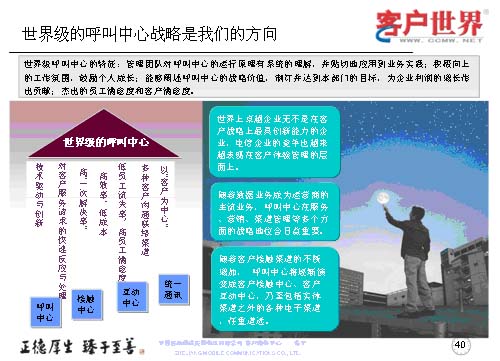 最后我想世界級的呼叫中心戰(zhàn)略是我們從事客戶服務行業(yè),從事呼叫中心人的方向,從我們理解的世界級呼叫中心特征來講,管理團隊應對呼叫中心的運營原理有系統(tǒng)的理解,并貼切地應用到業(yè)務實踐,創(chuàng)造積極向上的工作氛圍,鼓勵員工成長,能夠闡述呼叫中心的戰(zhàn)略價值,制訂并達到本部門的目標,為企業(yè)利潤的增長作出杰出的貢獻,杰出的員工滿意度和客戶滿意度。所以世界級呼叫中心我們理解是從七個方面來衡量,以“客戶為中心”,多種客戶溝通的聯(lián)絡渠道,低員工流失率和高客戶滿意度,高效率、低成本,高“一次性解決率”,對客戶服務請求的快速反應與處理,技術驅動與創(chuàng)新。