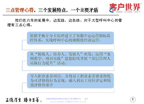 在這六年中,我們有三點管理心得,三個發(fā)展特點,一個主要矛盾。我們邊實踐邊總結,對大型呼叫中心運營的管理有三點心得:
