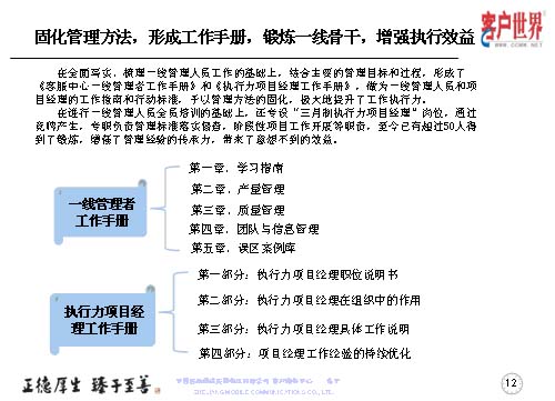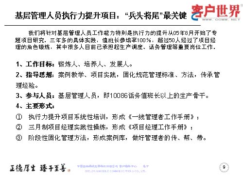 大家知道基層管理人員其實是兵頭將尾的最關鍵,我們將對基層管理人員的工作能力,特別是執(zhí)行力的提升是從05年8月份就開始了專項研究,三年多的具體實踐,值班長的培訓率達到100%,超過50人經過了項目經理的角色鍛煉,目前很多擔任過項目經理的已經承擔了生產調度、話務管理等重要的管理崗位。在這個項目當中,我們從四個方面入手,工作目標是鍛煉人、培養(yǎng)人、發(fā)展人。指導思想是案例教育、項目實踐,固化規(guī)范管理標準、方法,傳承管理經驗。參與人員就是基層管理人員,話務值班長以上的生產骨干。我們主要運用的形式是執(zhí)行力提升項目系統(tǒng)培訓,形成了《一線管理者工作手冊》。三月制項目經理的實踐操練,通過競聘的方式產生,形成了《項目經理工作手冊》。階段性的固化-優(yōu)化-再固化的管理方法,形成案例庫,做好管理者的傳幫帶。