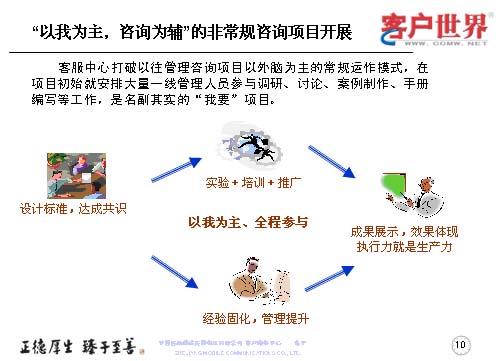 這個管理咨詢項目開展中,是以我為主,咨詢?yōu)檩o的非常規(guī)咨詢項目,打破的是以外腦為主的常規(guī)運作模式,在項目初期就有大量的一線管理人員參與調研、討論、案例制作、手冊編制,是名副其實的“我要”項目。那么在這個方面我們分成了三部曲,設計標準、達成共識,通過實驗加培訓推廣,以我為主的全程參與,來固化經驗,提升管理。最后成果展示,效果體現(xiàn)于執(zhí)行力,彰顯出生產力。