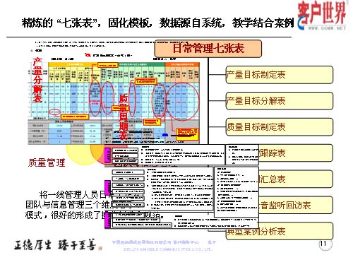 我們精煉了這么七張表的方式,運用三個維度:產量管理、質量管理和團隊與信息管理,而這些基礎數(shù)據都來自于系統(tǒng),教學和案例。而七張表是從產量、質量和團隊信息來展現(xiàn)出具體的一些應用,將一線管理人員從日常工作的三個維度入手,形成七張表管理模式,很好地具備了操作標準和規(guī)范。這模板表除了系統(tǒng)出來的一些數(shù)據以外,通過我們基層管理人員的項目執(zhí)行和跟蹤檢查,形成一些案例,改進計劃和改進意見。這幾張表多為系統(tǒng)自身所產生一些具體的數(shù)據,比如說上個月的指標值如何設定,實際達成的產量怎樣,回訪滿意率具體有哪些數(shù)據,都在客服系統(tǒng)的報表中提煉出來的相關數(shù)據。