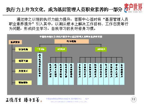 在執(zhí)行力上升文化的同時,基層管理者的職業(yè)素養(yǎng)是我們時刻去追求的,所以客服中心適時地將基層管理人員的職業(yè)素養(yǎng)引入到其中,以期從根本上解決工作目標、工作態(tài)度等問題,形成終生學習,自我學習的良好修身習慣。這是我們客服中心基層管理人員職業(yè)素養(yǎng)的一個體系圖,首先從素養(yǎng)要求的四個維度,行為準則的一、五、九來展現(xiàn)。一個目標是成為優(yōu)秀的管理者,五個注重是注重客戶需求、注重工作細節(jié)、注重團隊建設、注重總結匯報、注重制度落實。九種能力:目標計劃能力,貫徹執(zhí)行能力、分析解決能力、協(xié)調溝通能力、總結創(chuàng)新能力、時間管理能力、師人育人能力和標桿超越能力。這個一、五、九,讓它彰顯出素養(yǎng)和表現(xiàn)的四個維度,以身作則、培育下屬、關愛員工和鍛造團隊。
