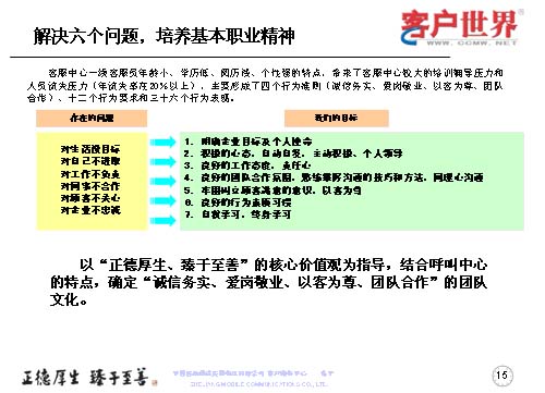 一線客服人員如何來全面提升職業(yè)能力,首先是解決一線客服人員的六個問題,剛才已經跟大家交流了客服中心一線人員的人員結構,當前的六個主要問題可以用簡單的幾個方面來表述:對生活沒有明確的目標、對自己不進取、對工作不負責、對同事不合作、對顧客不關心、對企業(yè)不忠誠,這是在日常工作中,一線人員所存在的問題。而針對這些問題,我們要用工作目標去持續(xù)解決和克服問題,所以我們采取的是讓大家明確企業(yè)目標與個人使命,用積極的心態(tài)自主自發(fā),主動積極和個人領導;良好的工作態(tài)度責任心,良好的團隊合作氛圍;熟練掌握溝通技巧和方法,牢固樹立顧客滿意的意識,以客為尊;良好的行為素質習慣,自我學習,終身學習。從而在中國移動集團“正德厚生、臻于至善”的核心價值觀指導下,結合呼叫中心特點,確定誠實務信,愛崗敬業(yè),以客為尊、團隊合作的團隊文化。