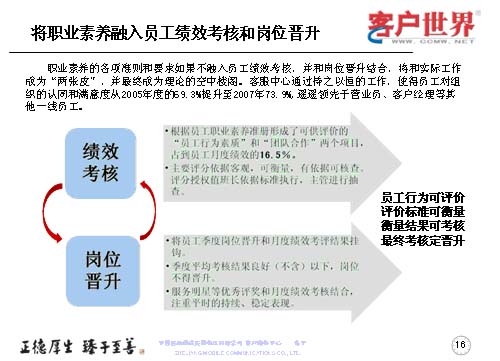 職業(yè)素養(yǎng)不是說在嘴上,講在課上,而是更多地融入到員工的績效考核于崗位晉升當中。以解決工作素養(yǎng)要求和實際工作的兩張皮,以及使得客服理念成為理論的空中樓閣。所以我們是持之以恒地開展一線員工組織認同滿意度調查,我們每年都會做一線客服人員的滿意度調查,在滿意度調查當中,從05年的69.3%,提升到07年的73.9%,而且遙遙領先于營業(yè)員和客服經理。而在績效考核中主要把員工行為素質、團隊合作占到了員工月度績效的16.5%,使大家認識到作為一個組織中的一員,作為團隊我們是為了一個共同的目標,彼此依賴、彼此信任,同時也要強化績效來管理。所以主要的評分依據是客觀、可衡量、有依據可查,同時也把這些也作為客服人員季度晉升和月度績效考評掛鉤,如果該員工季度的平均考核在良好以下的話,將得不到晉升,最終實現(xiàn)的是員工行為可評價,評價標準可衡量,衡量結果可考核,最終考核定晉升。