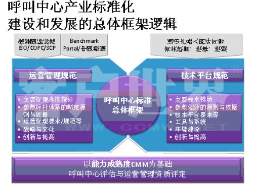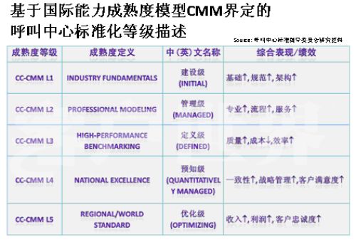 Markets)呼叫中心產(chǎn)業(yè)深入研究相結(jié)合的成果。。我在前幾年企業(yè)實(shí)施標(biāo)準(zhǔn)的時(shí)候深入研究了這套模型,這套模型對(duì)我們呼叫中心產(chǎn)業(yè)有極大的適用性,幾乎每個(gè)呼叫中心都可以在這套模型找到定位,從一個(gè)渾沌的初始過程到管理者,如果能夠建設(shè)一個(gè)持續(xù)的管控的流程到定義級(jí),如何進(jìn)行一致化管理,再到預(yù)知級(jí),幾乎每個(gè)呼叫中心從大到小,從年輕到發(fā)展一段時(shí)間都可以找到自己的定位,所以我們?cè)谠瓉淼男畔a(chǎn)業(yè)指導(dǎo)委員會(huì)的支持下,我們重新結(jié)合CMM模型開發(fā)出了符合我們呼叫中心發(fā)展的一個(gè)標(biāo)準(zhǔn),我建議大家把它看成是一個(gè)模型,整個(gè)國(guó)際產(chǎn)業(yè)都定性了標(biāo)準(zhǔn),因?yàn)榇蠹叶贾繡MM模型是一個(gè)開放性的知識(shí)體系,并不是一個(gè)封閉標(biāo)準(zhǔn)。CMM模型,首先你的呼叫中心建設(shè)要能夠符合呼叫中心的定義,不是找?guī)着_(tái)話機(jī)或?qū)ν庥袀(gè)一個(gè)客服號(hào)碼對(duì)外就能稱為呼叫中心。