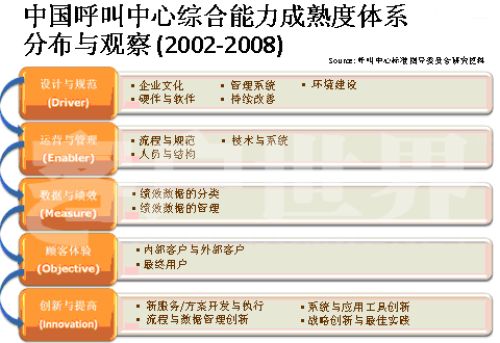 在過去幾年我們也做了很多研究,一個(gè)呼叫中心整合持續(xù)建設(shè)在哪些方面應(yīng)該做定義;旧衔覀兪欠譃槲鍌(gè)方面,在每一級(jí)的成熟度方面,我們的呼叫中心都關(guān)注自己的成熟度。1、設(shè)計(jì)與規(guī)范;2、運(yùn)營(yíng)管理;3、數(shù)據(jù)與績(jī)效;4、顧客體驗(yàn);5、創(chuàng)新與提高。第五方面創(chuàng)新與提高在CMM模型中是特有的,它在整個(gè)產(chǎn)業(yè)的發(fā)展過程中,提供戰(zhàn)略革新和戰(zhàn)略工具一體化使用的指導(dǎo)框架和最佳實(shí)踐。