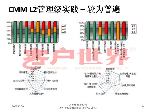 接下來我用一個(gè)很小的案例結(jié)束今天的分享,我們整個(gè)的呼叫中心的成熟度模型目前是在電信行業(yè)開始了2008年版的推廣,成熟度模型經(jīng)歷從07年成立亞太呼叫中心產(chǎn)業(yè)聯(lián)盟以后,由一群這個(gè)行業(yè)里面的專家,特別是中國(guó)產(chǎn)業(yè)市場(chǎng)的發(fā)展建立起的標(biāo)準(zhǔn),一年以來在通信行業(yè)我們做的能力成熟度的判定有一些很有意思的啟示,通信行業(yè)占到我們整個(gè)呼叫中心產(chǎn)業(yè)約70%的坐席,是最大的、最有代表性的產(chǎn)業(yè)。做下來真的很有代表性,普遍性在于環(huán)境建設(shè)、資產(chǎn)投入、資產(chǎn)配置,所以這下面的雷達(dá)就可以看到,相對(duì)完善都是在環(huán)境建設(shè),功能區(qū)建設(shè),整體空間設(shè)計(jì)、硬件相對(duì)來說比較偏硬的一些。在其他方面偏廢的比較厲害。第二個(gè)雷達(dá)在一些獎(jiǎng)懲管理、信息管理,整個(gè)軟性方面幾乎有很濃重的一些計(jì)劃經(jīng)濟(jì),制造行業(yè)的一些領(lǐng)域相對(duì)來說比較成熟。我們目前看到的,基本上通信行業(yè)的一些發(fā)展在能力成熟度上是二級(jí)到四級(jí),尤其以二到三級(jí)的發(fā)展更為普遍。通常的方法為期一周的標(biāo)桿調(diào)研,看所有的呼叫中心發(fā)展的五個(gè)方面,我們才會(huì)在里面做這樣的判定。在能力成熟度的三級(jí),我們做了一些企業(yè)發(fā)現(xiàn),特別在三級(jí),關(guān)于能不能對(duì)流程進(jìn)行一致性管理方面,就是剛才李老師講到的不是最急的,而管理是最重要的?赡芩械牧鞒潭喽嗌偕儆幸恍┏墒於鹊膯栴},但是我們的源頭流程能力在三個(gè)方面有很大的差距:一個(gè)是業(yè)務(wù)監(jiān)控流程,第二個(gè)數(shù)據(jù)收集流程,還有一個(gè)是管理系統(tǒng)的審核流程。這個(gè)大家可以和自己的呼叫中心比一比。