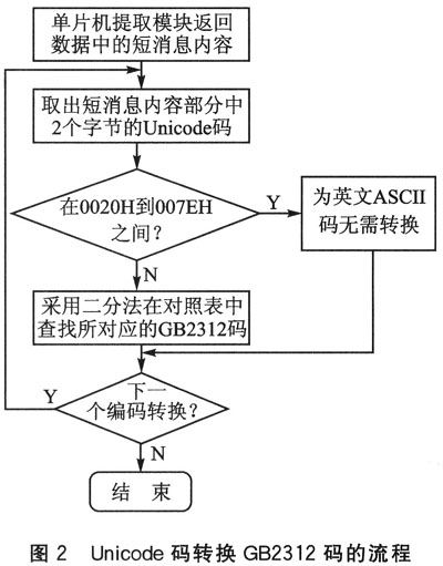單片機(jī)通過(guò)串口與模塊連接后,發(fā)送讀取第一條新短消息指令:“AT+CMGR=1”。提取模塊接收的短消息后,先判斷其內(nèi)容是否為ASCII碼。若為ASCII碼,則無(wú)需轉(zhuǎn)換直接讀取;否則,通過(guò)查表法查找其對(duì)應(yīng)的漢字GB碼,實(shí)現(xiàn)不同編碼間的轉(zhuǎn)換。轉(zhuǎn)換流程如圖2所示。