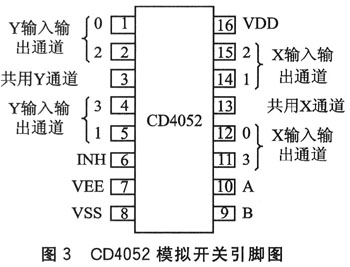 51系列單片機(jī)一般只有一個(gè)串行通路,通過(guò)串口與GSM模塊連接后,則不能再連接其他串口設(shè)備;而一些串口擴(kuò)展芯片成本較高,連接也較麻煩。本方法利用數(shù)控模擬開(kāi)關(guān)CD4052來(lái)做多串口擴(kuò)展器,成本低廉而且接線(xiàn)簡(jiǎn)單。其引腳排列如圖3所示。