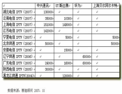 在IPTV設(shè)備供應(yīng)商中,各家廠商各有千秋,其中在國內(nèi)市場占有率最好的是中興通訊,其次是UT斯達(dá)康、華為、上海貝爾阿爾卡特。中興通訊跟華為均能提供端到端的解決方案,從頭端到客戶端,從業(yè)務(wù)層到傳輸層,提供完整的設(shè)備,可以使用統(tǒng)一的平臺對整個系統(tǒng)進行管理,并且在保證統(tǒng)一的同還提供了較好的開放性,支持多家內(nèi)容提供商及STB的接入。